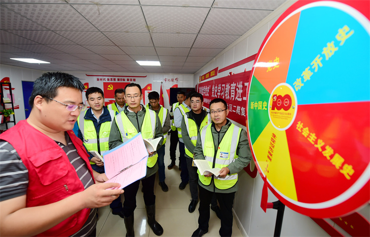 在項(xiàng)目辦公區(qū)單獨(dú)設(shè)立黨建活動(dòng)場(chǎng)所,將黨旗、入黨誓詞、黨員名單、黨內(nèi)制度、黨支部組織架構(gòu)等內(nèi)容上墻。在工地現(xiàn)場(chǎng)通過(guò)設(shè)置黨建活動(dòng)宣傳欄、黨建文化宣傳長(zhǎng)廊、黨建文化墻、懸掛黨建宣傳標(biāo)語(yǔ)等方式,營(yíng)造工地黨建氛圍,把紅色精神傳遞每一位建設(shè)者。