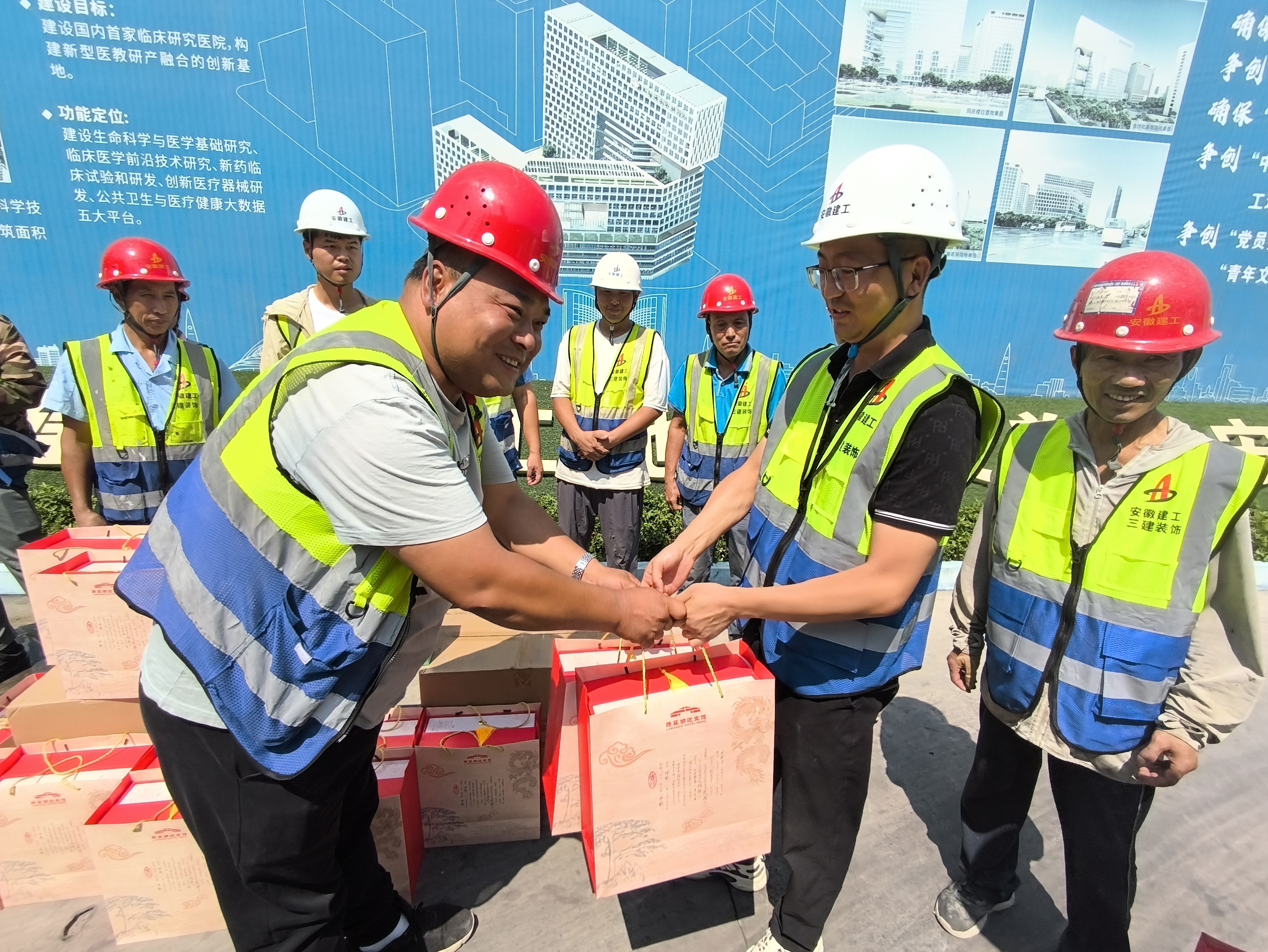佳節(jié)“不打烊”,奮力“搶進度”。中科院項目建設者們搶抓工期,在這個闔家團圓的重要節(jié)日,主動放棄與家人團聚的機會,在項目上揮灑汗水、辛苦付出,為城市的現(xiàn)代化建設默默奉獻著。裝飾公司開展慶中秋慰問活動,為建筑工人們送上中秋月餅和中秋祝福。